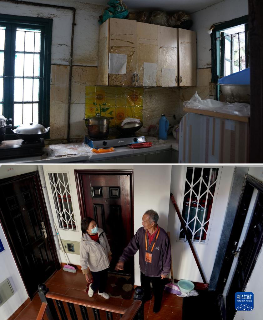拼版照片:上图是2018年10月11日拍摄的改造前的三户合用的公共厨房(曹杨新村村史馆提供);下图是10月28日拍摄的经过改造后,公用厨房部位变成公用空间,准备回搬的居民们在交流感想(新华社记者刘颖摄)。 新华社发