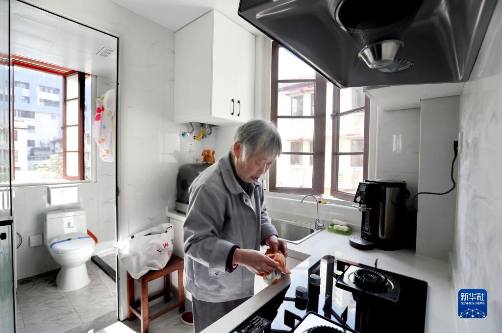 11月23日,曹杨一村居民、73岁的高林林在刚回搬的家中清扫。1952年,高林林随父母搬入曹杨一村,居住69年后,她拥有了自家独用的厨房和卫生间。新华社记者 刘颖 摄