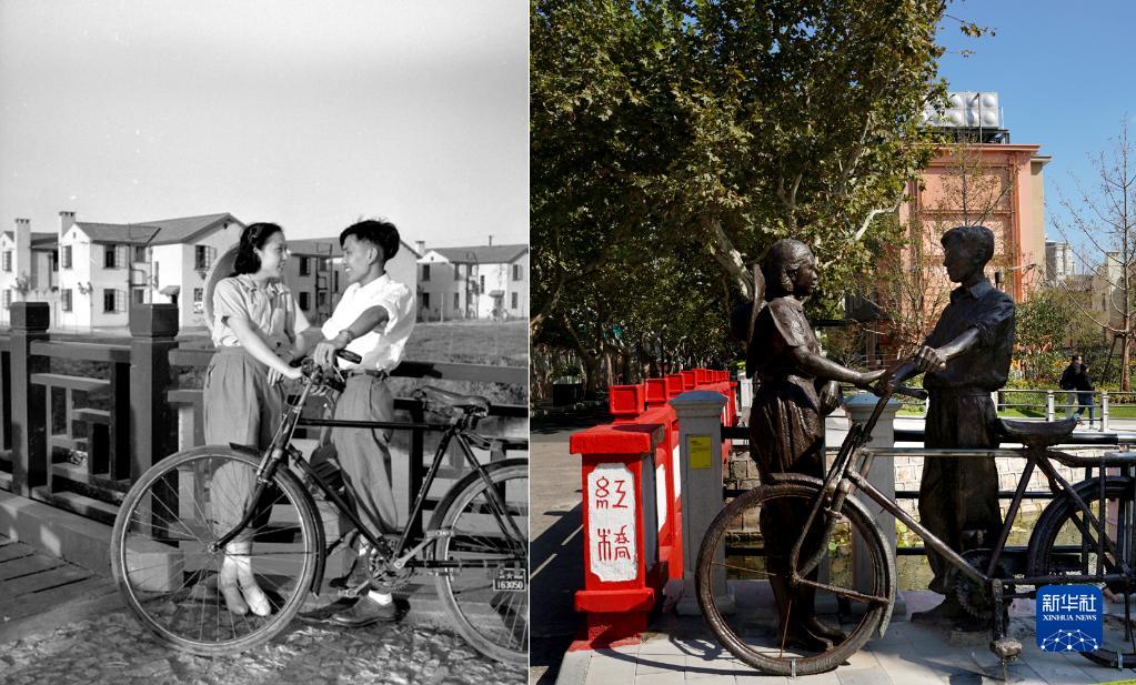 曹杨一村旁的红桥是其周边标志性风景点,改造项目让经典的记忆留在这里。拼版照片:左图是上世纪50年代的一对男女站在红桥边的老照片(曹杨新村村史馆提供);下图是10月28日拍摄的红桥边的老照片场景的雕塑(新华社记者刘颖摄)。 新华社发
