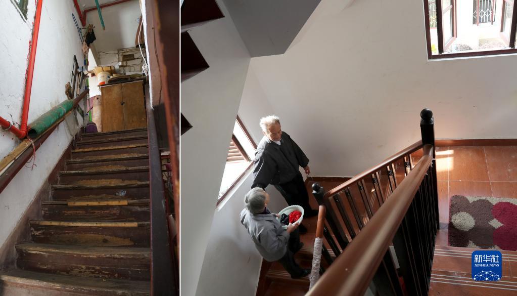 拼版照片:左图是2018年10月11日拍摄的改造前的陡峭破旧的木楼梯(曹杨新村村史馆提供);下图是11月23日拍摄的完成改造后,平缓宽敞、更适合老年人的楼梯(新华社记者刘颖摄)。 新华社发