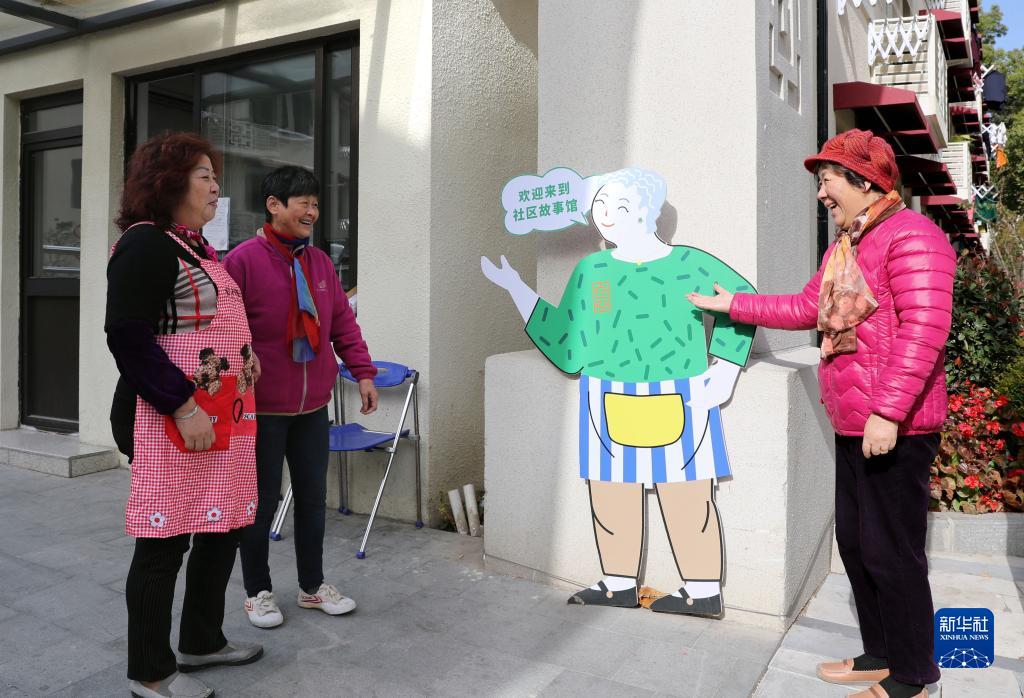 11月23日,1952年入住曹杨一村至今的居民孙雅芬(右一)和邻居们来到社区故事馆,准备开始志愿者工作。新华社记者 刘颖 摄