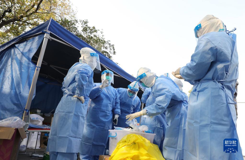 11月26日,从青浦区各个医院抽调来的医护人员,准备进入西郊锦庐小区进行核酸采样工作。
