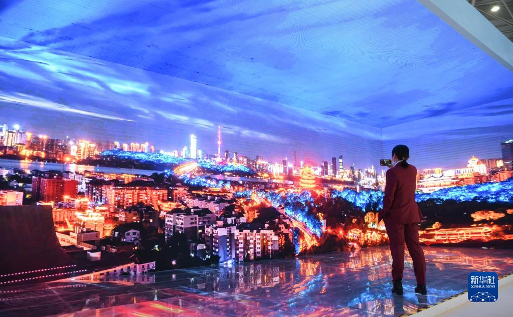 11月26日,一名参观者在武汉展区观看全景视频。
