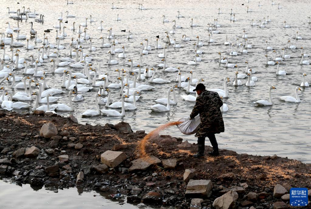 黄河湿地管理处的工作人员向白天鹅聚集区抛撒食物(11月26日摄)。