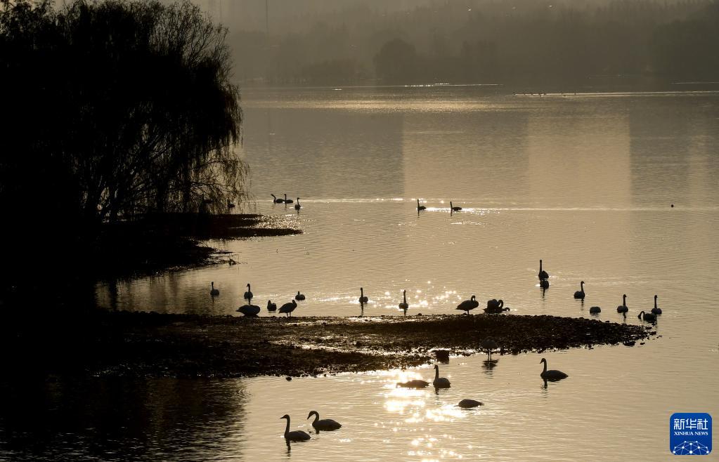 近日,大批白天鹅从西伯利亚迁徙到河南省三门峡市黄河湿地栖息越冬,形成一幅宁静和谐的美丽画卷。