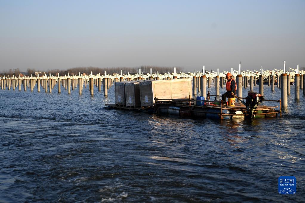 11月24日,在安徽省肥东县古城镇蒋集水库“渔光互补”光伏电站,工人将光伏板运往安装现场。