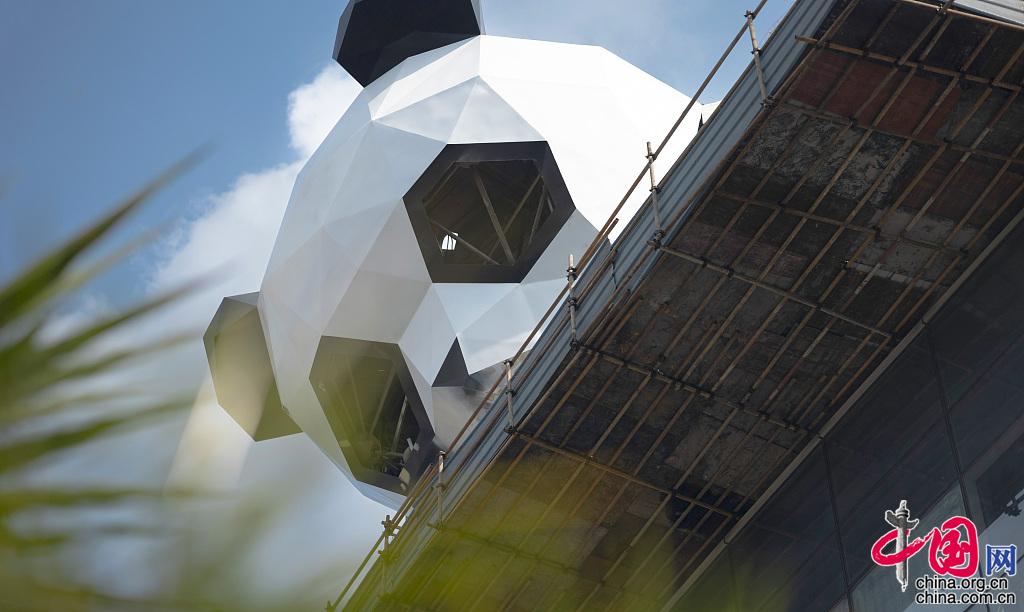 2021年12月1日,成都339电视塔下综合体上的平台上,赫然出现了一只呈匍匐状的钢结构大熊猫,憨态的熊猫头脸朝下呆萌的望着府河桥上的行人,它的两只前肢虽还没安装好,但其呆萌的表情就足以萌翻过往的市民。图片作者:华小峰/视觉中国