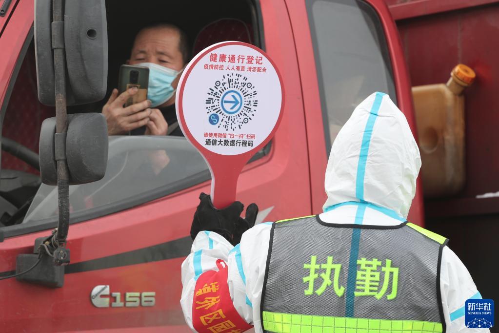 12月3日,在哈尔滨市一高速公路出城口,工作人员指导车内人员扫码登记。