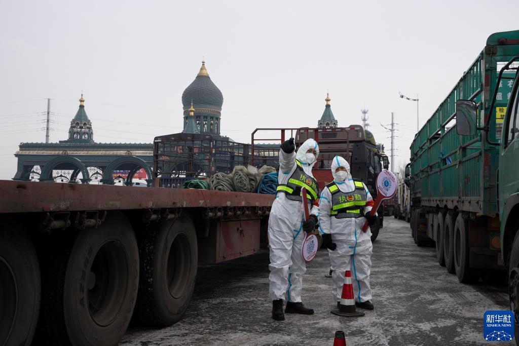 12月3日,在哈尔滨市一高速公路出城口,工作人员在引导车辆出城。