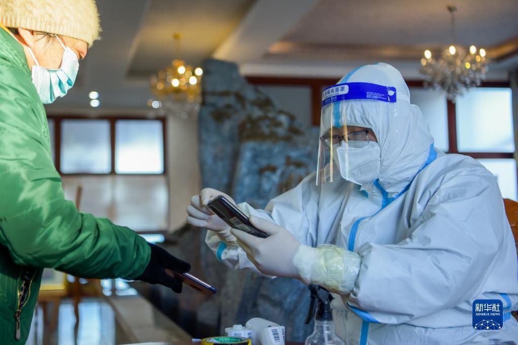 12月6日,在满洲里市新元国际小区,志愿者为前来进行核酸采样的居民录入信息。