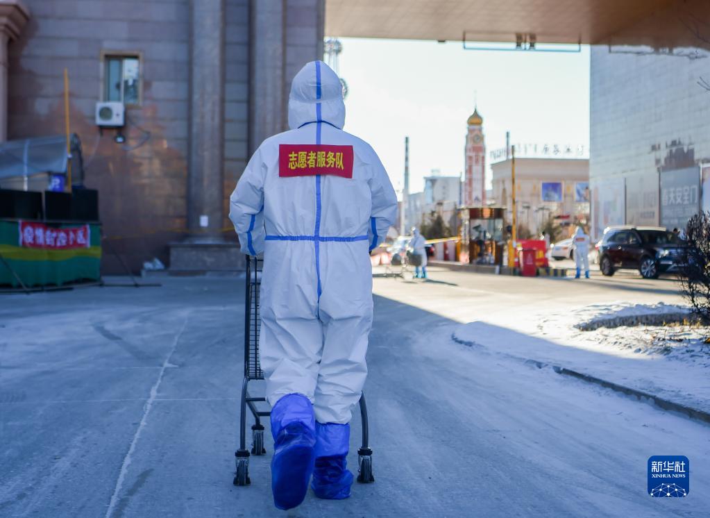 12月5日,在满洲里市尚都国际小区,志愿者为居民送物资。