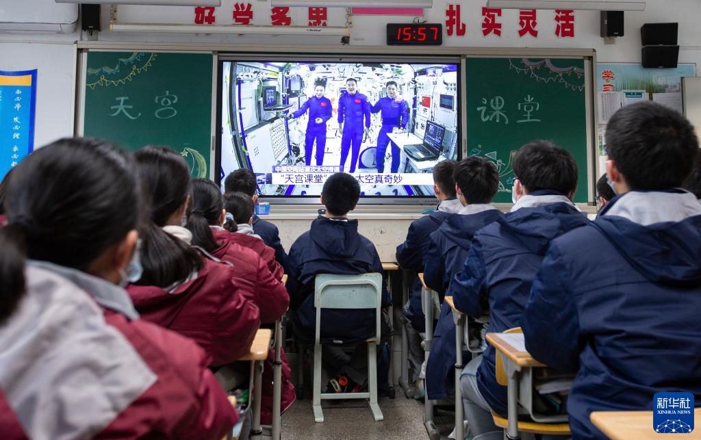 12月9日,南京市第二十七高级中学的学生在教室收看“天宫课堂”第一课。当日,“天宫课堂”第一课开课,神舟十三号乘组航天员翟志刚、王亚平、叶光富在空间站进行太空授课。新华社发(苏阳 摄)
