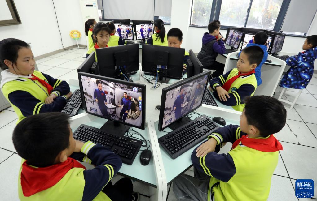 12月9日,江苏省苏州市金阊实验小学校的学生在收看“天宫课堂”第一课。当日,“天宫课堂”第一课开课,神舟十三号乘组航天员翟志刚、王亚平、叶光富在空间站进行太空授课。新华社发(杭兴微 摄)