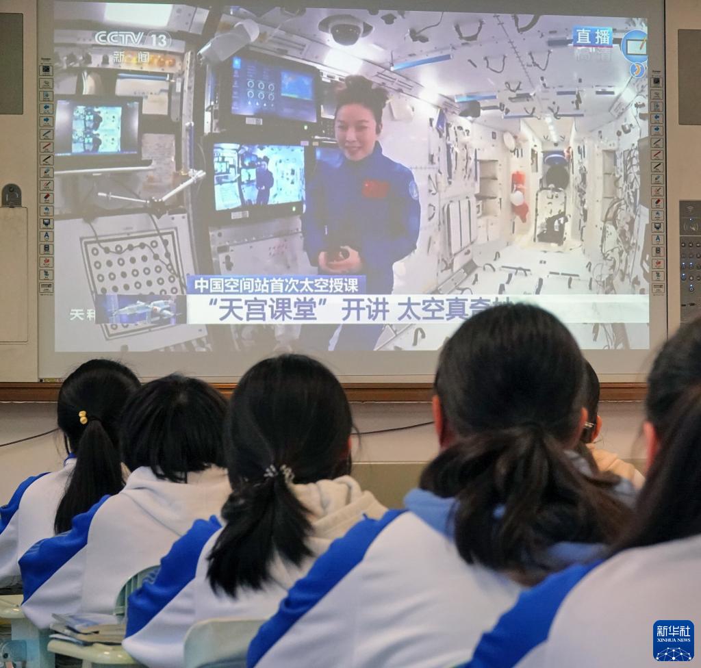 12月9日,在航天员王亚平的母校山东烟台福山一中,学生们观看王亚平授课。当日,“天宫课堂”第一课开课,神舟十三号乘组航天员翟志刚、王亚平、叶光富在空间站进行太空授课。新华社发(唐克 摄)