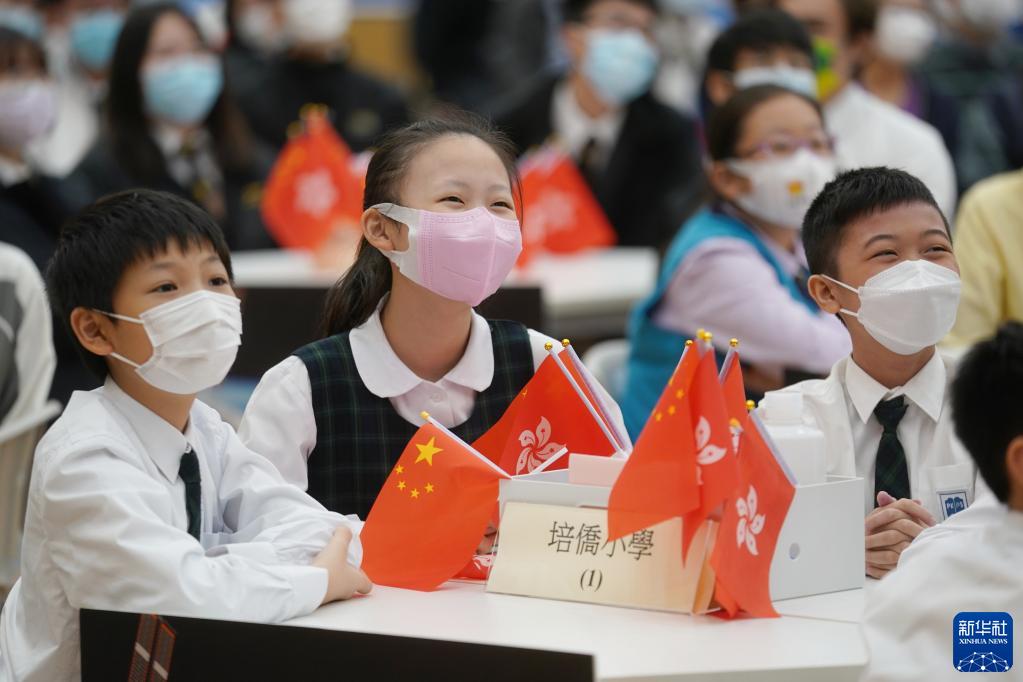 12月9日,在位于香港培侨书院的分课堂,香港小学生在认真听课。当日,“天宫课堂”第一课开课,神舟十三号乘组航天员翟志刚、王亚平、叶光富在空间站进行太空授课。新华社记者 王申 摄