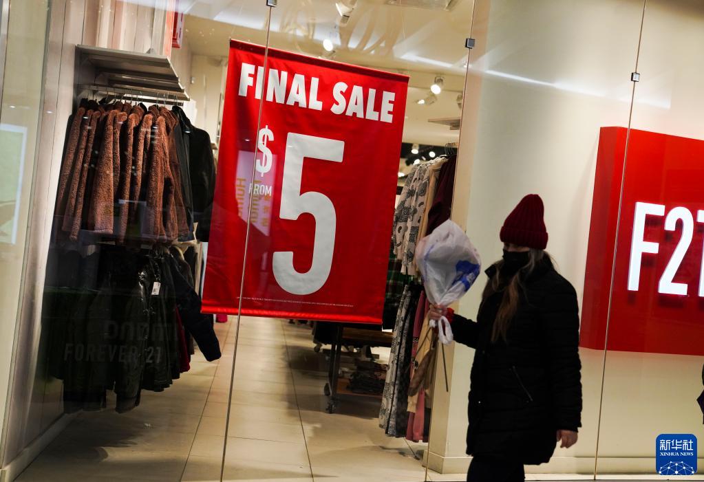 12月10日,一名女子从美国纽约一家购物中心内的促销广告旁走过。