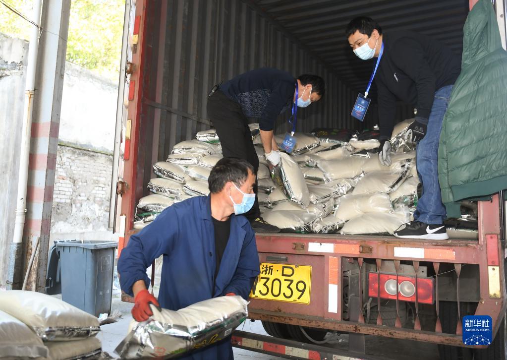 12月15日,在上虞区百官粮油公司,工作人员往厢式货车内装运大米,配送到相关社区。