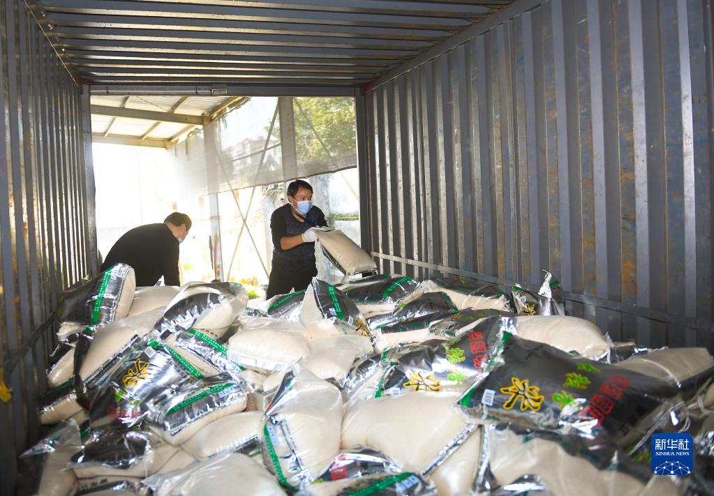 12月15日,在上虞区百官粮油公司,工作人员往厢式货车内装运大米,配送到相关社区。