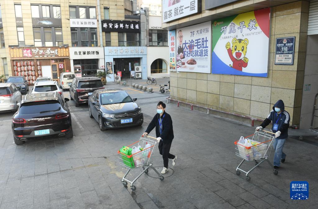 12月15日,在上虞区大通购物中心,工作人员接到订单后为附近社区配送生活物资。疫情期间,该中心被临时征用为急需日用消费品配送中心。
