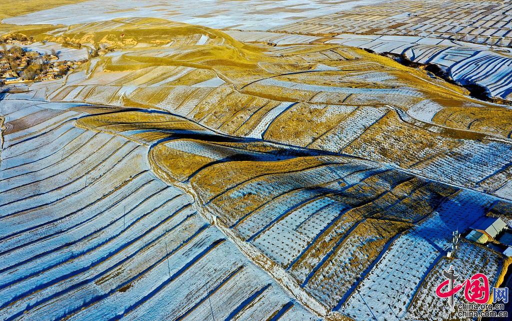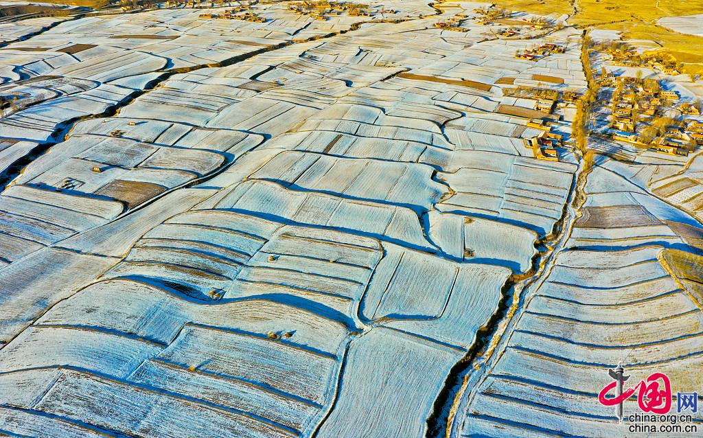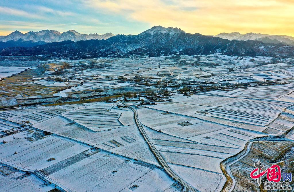 近日来,受强冷空气影响,甘肃祁连山区连降瑞雪,雪后放晴,位于祁连山下甘肃省民乐县丰乐镇易家湾村呈现出沃野良田阡陌纵横万亩相连的美丽水墨丹青画卷。