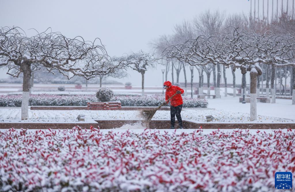 12月17日,在山东省荣成市滨海公园,工作人员在清扫积雪。