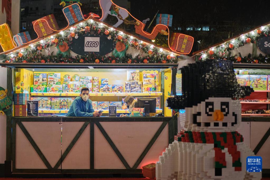 12月24日,戴口罩的店员在西班牙马德里一处圣诞集市工作。