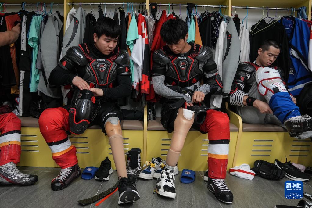 12月23日,在北京顺义中国残疾人体育运动管理中心的国家残疾人冰上运动比赛训练馆,中国残奥冰球队队员张政(中)、王聚江(左)在训练前换上装备。