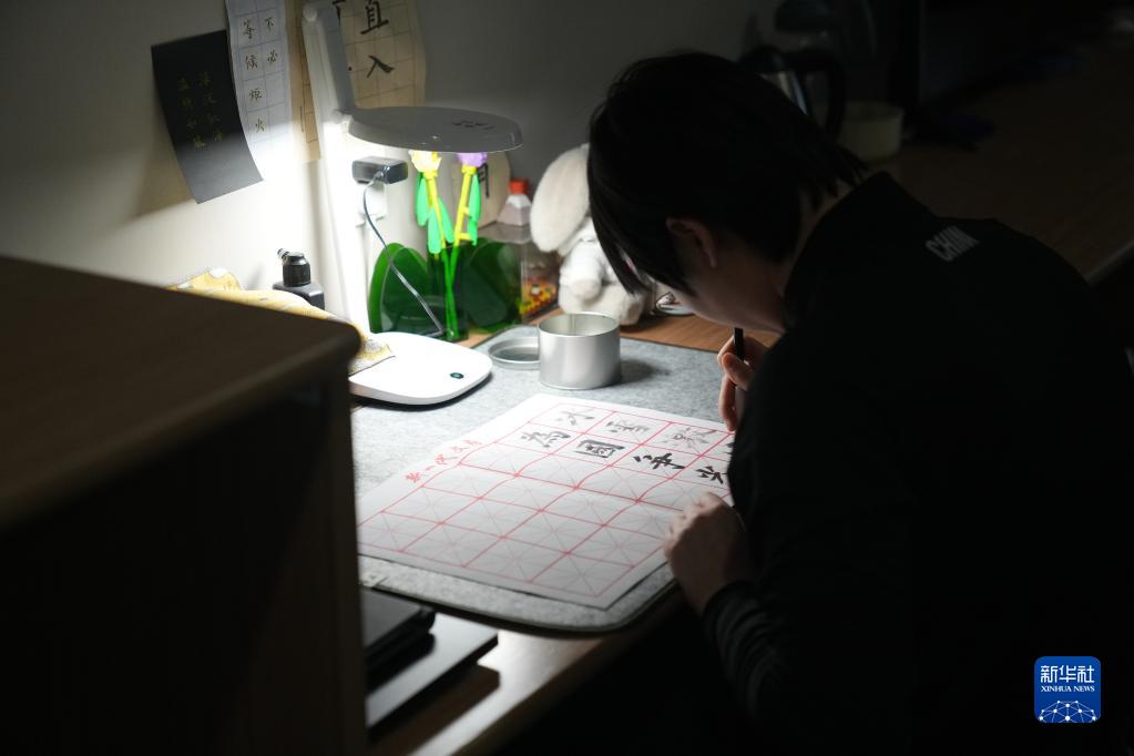12月23日,在北京顺义中国残疾人体育运动管理中心的运动员公寓,轮椅冰壶运动员张曈在写毛笔字。