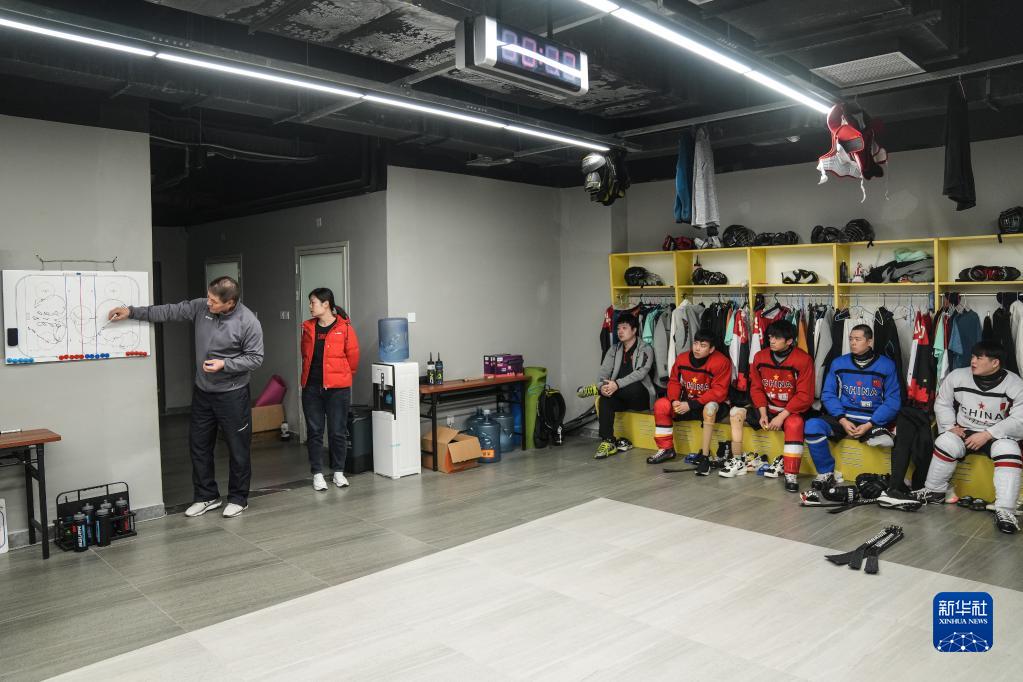 12月23日,在北京顺义中国残疾人体育运动管理中心的国家残疾人冰上运动比赛训练馆,中国残奥冰球队俄罗斯籍教练尼古拉(左一)为球员们分析战术。