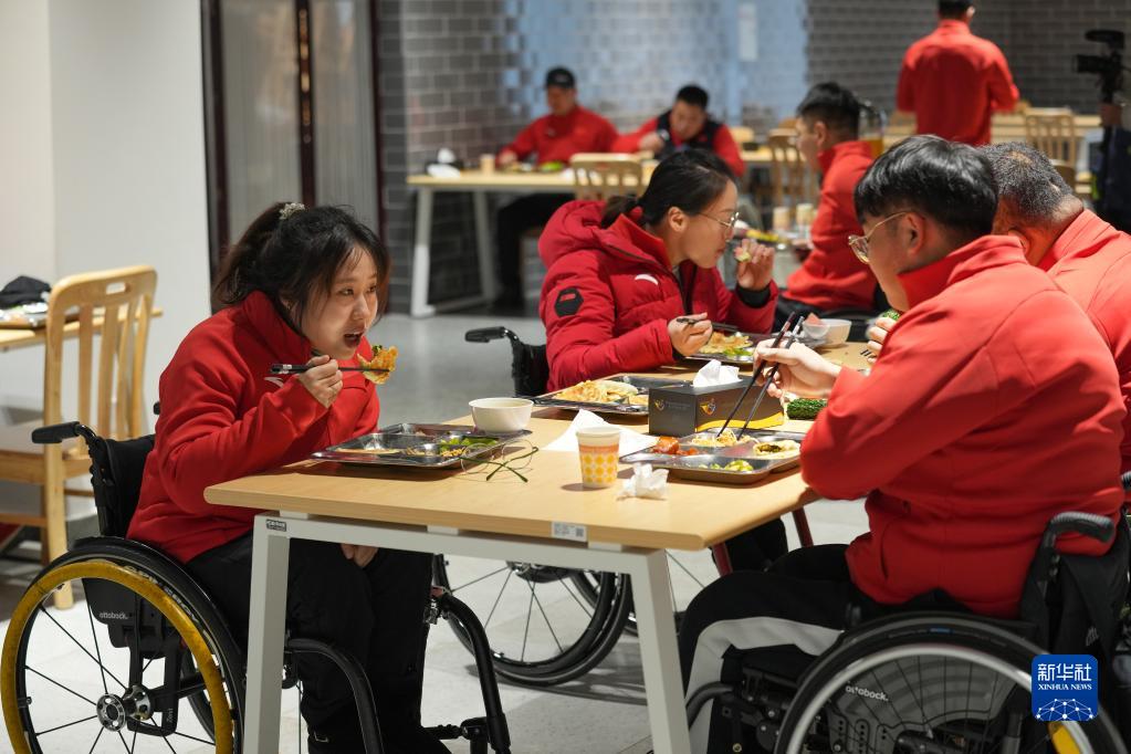 12月23日,在北京顺义中国残疾人体育运动管理中心的食堂,轮椅冰壶运动员闫卓(左一)与队员一起吃午餐。
