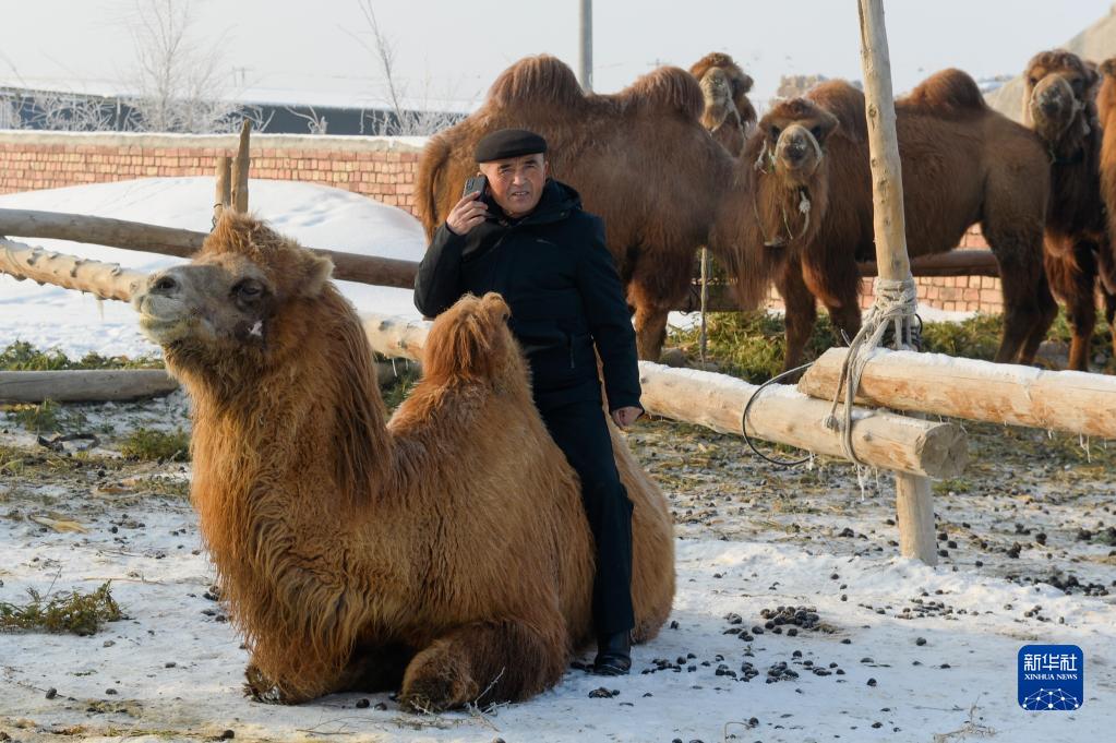 12月20日,新疆奇台县大泉塔塔尔族乡大泉湖村骆驼棚圈内,坐在骆驼上的伊力亚斯·肯接巴依正在联系收骆驼奶商家。新华社记者 高晗 摄