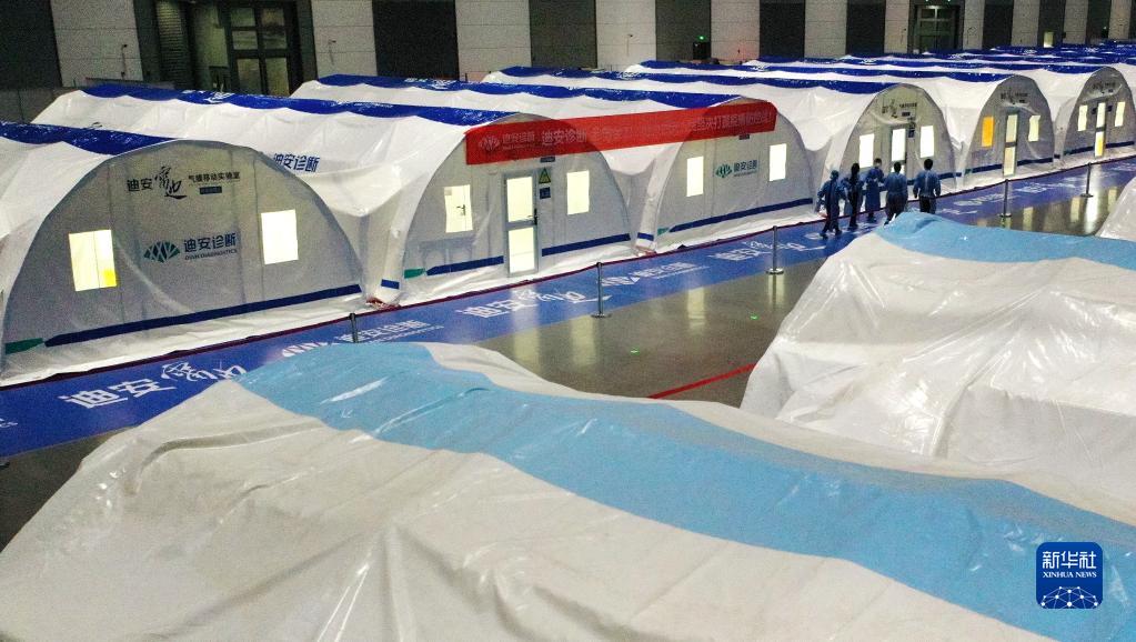 12月23日深夜,西安的街头清冷安静,在西安国际会展中心3号馆内刚刚启用的4套气膜实验室,身着防护服的工作人员正进行忙碌有序的核酸检测。据了解,4套实验室每日最高检测产能可达50万管,若按10混1采样方式,每日最高可完成500万人份的核酸检测任务。