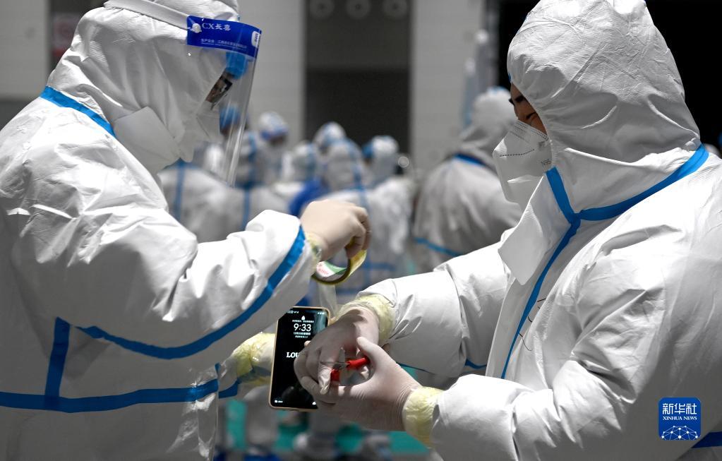12月23日,在西安国际会展中心,工作人员在进入气膜实验室之前用胶带封闭手套与防护服之间的缝隙。