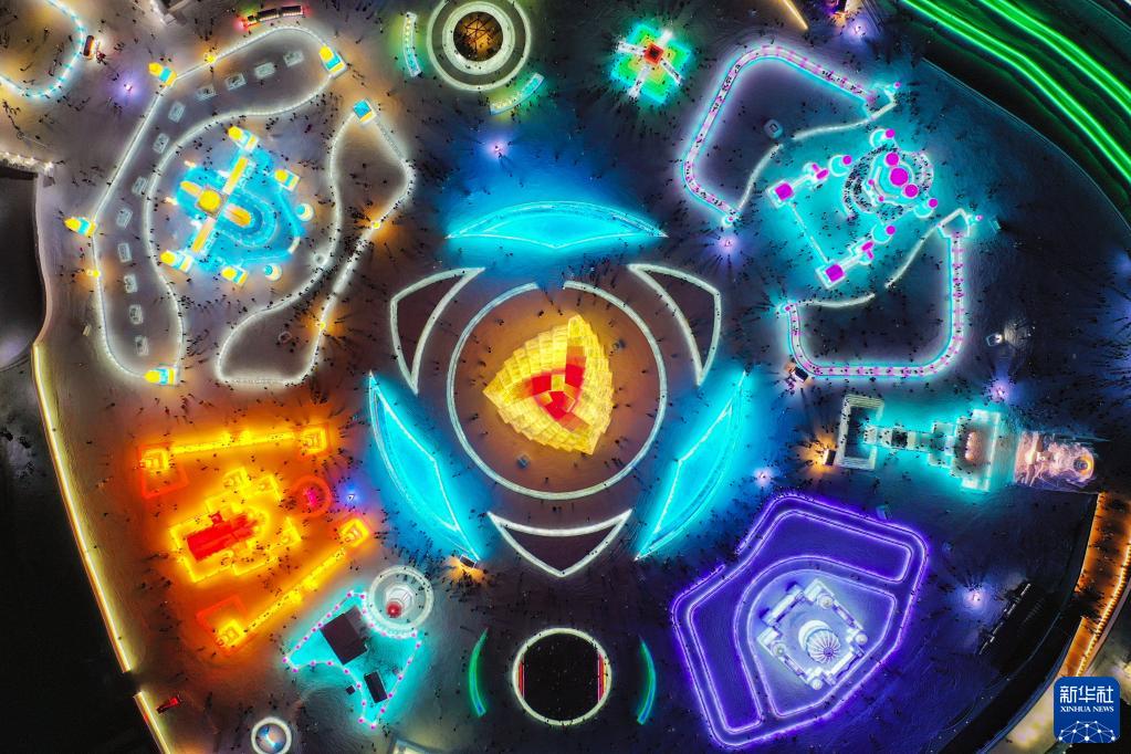 12月25日,游客在哈尔滨冰雪大世界园区游玩(无人机照片)。