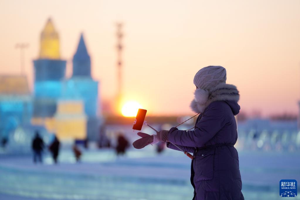 12月25日,游客在哈尔滨冰雪大世界园区游玩拍照。