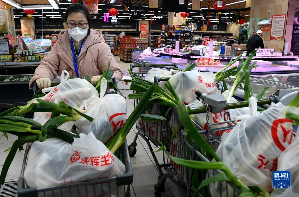 12月28日晚,在西安曲江新区一家超市内,工作人员分装即将配送的免费生活物资。新华社记者 刘潇 摄