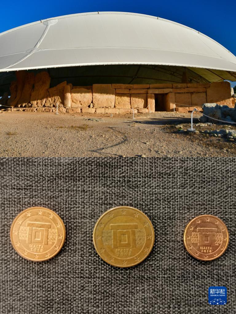 拼版照片:上图为2020年6月21日在马耳他格伦迪拍摄的姆那拉神庙(新华社发 乔纳森·博格摄);下图为2021年12月31日拍摄的印有姆那拉神庙图案的不同面值的欧元硬币(新华社记者陈文仙摄)。