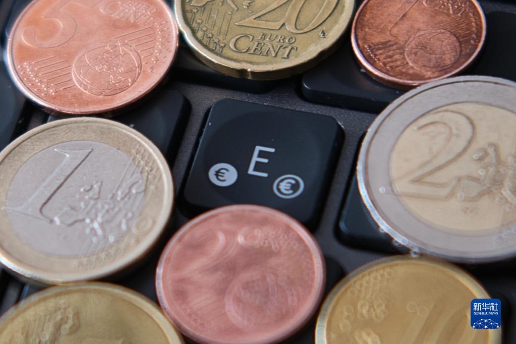 这是2021年12月31日在西班牙马德里拍摄的欧元硬币及键盘上的欧元符号。