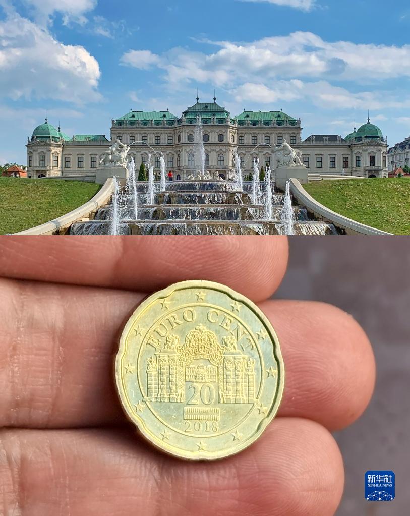 拼版照片:上图为2020年5月17日拍摄的奥地利维也纳美景宫;下图为2021年12月31日拍摄的印有美景宫图案的20欧分硬币。