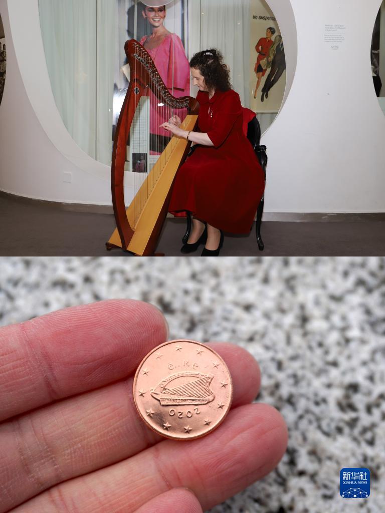 拼版照片:上图为2019年1月27日在爱尔兰基尔代尔郡拍摄的演奏竖琴的艺术家;下图为2021年12月31日在爱尔兰都柏林拍摄的印有竖琴图案的5欧分硬币。