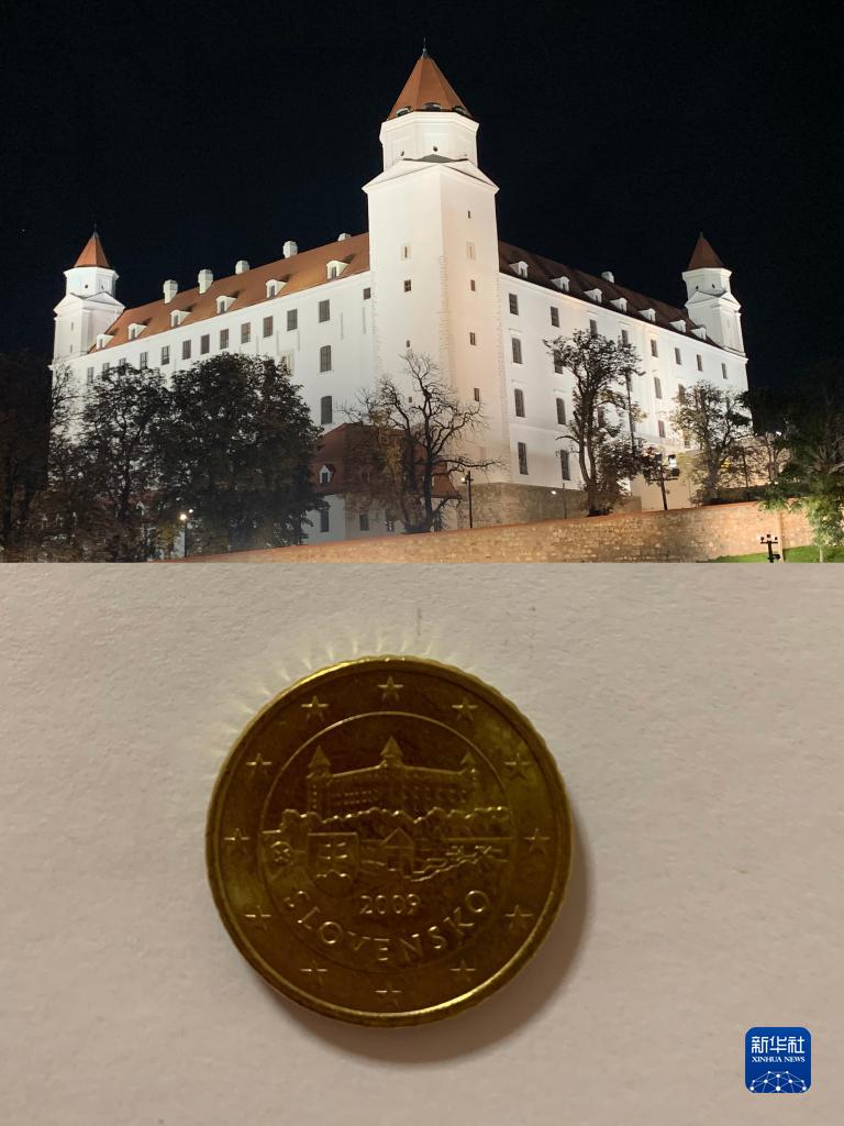 拼版照片:上图为2021年10月25日拍摄的斯洛伐克布拉迪斯拉发城堡(新华社记者蒋雪摄);下图为2021年12月31日拍摄的印有布拉迪斯拉发城堡图案的50欧分硬币(新华社发 瓦林斯基摄)。