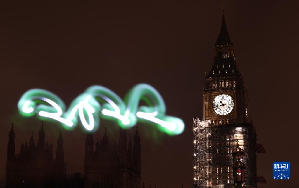 这是2021年12月31日在英国伦敦拍摄的大本钟和光绘“2022”。