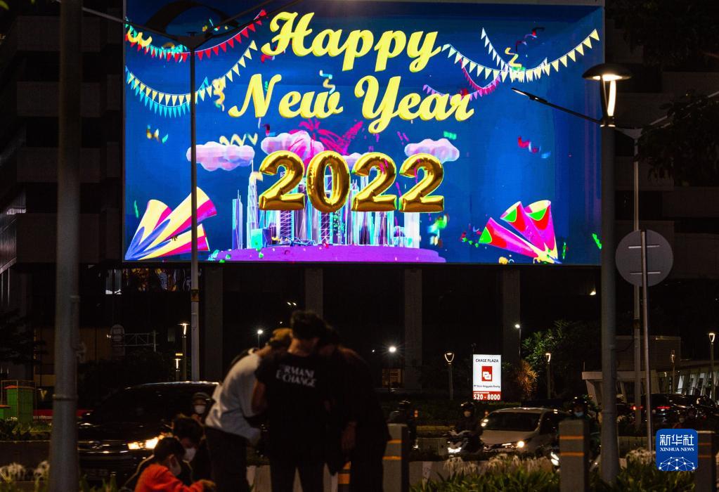 2021年12月31日,印度尼西亚雅加达街头的一块电子屏显示迎接新年的字样。