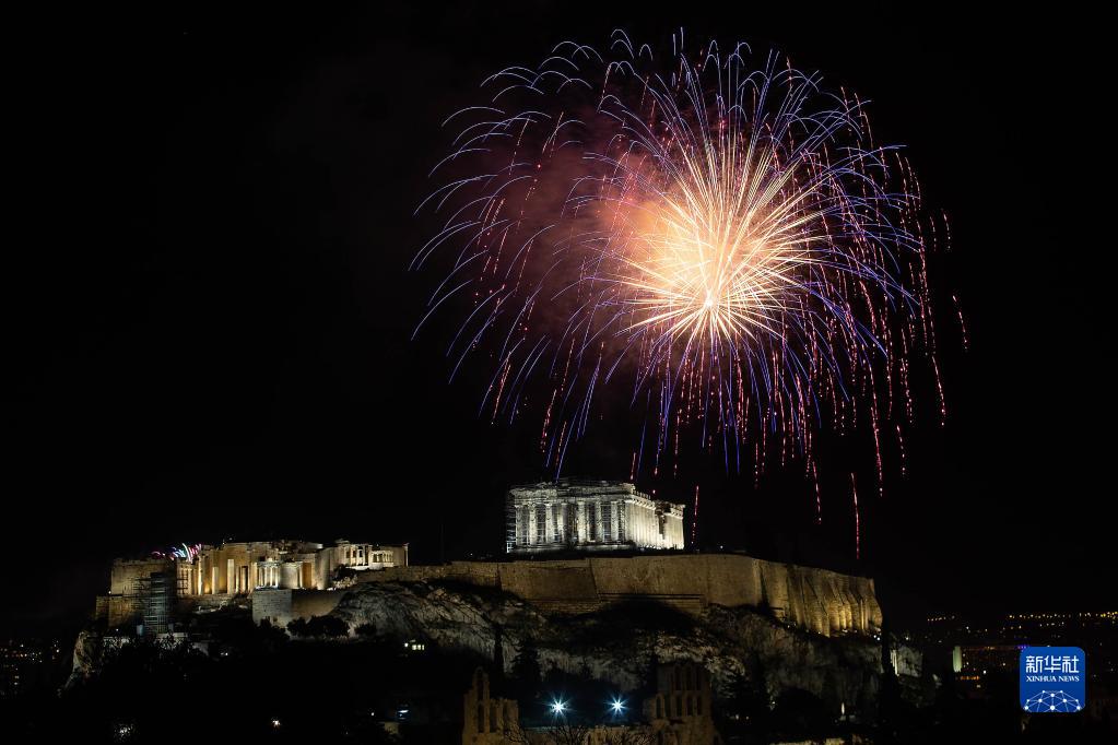 2022年1月1日,希腊雅典燃放烟花迎接新年。