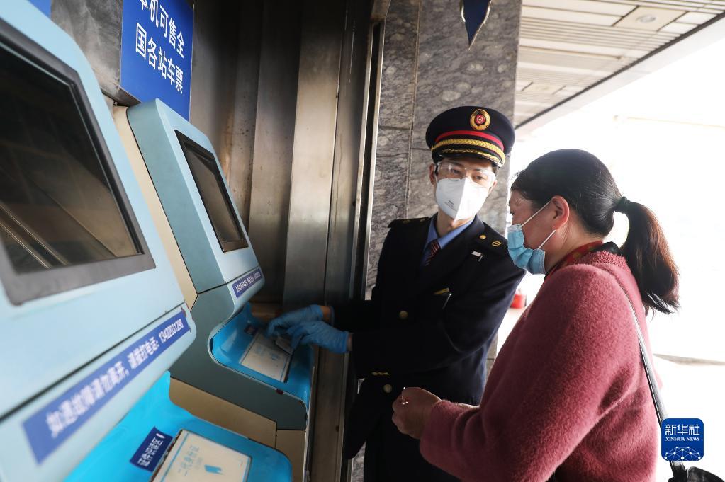 1月3日,广州火车站的工作人员在帮助一名旅客通过自动售票机购票。