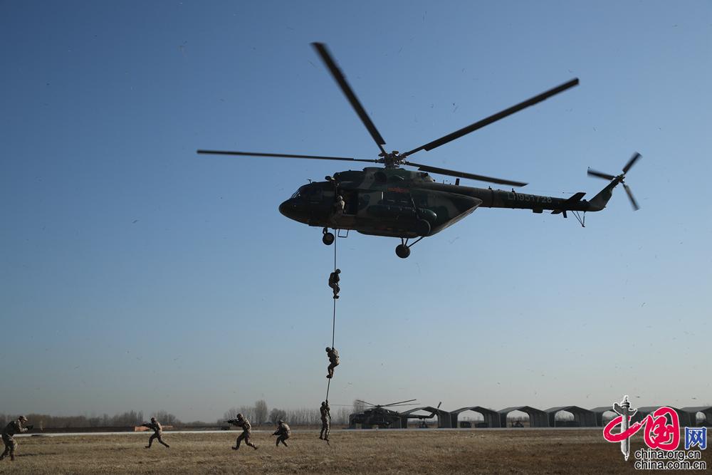 1月4日,陆军在某陆航旅训练场以视频会议形式进行陆军部队2022年开训动员。图为作战人员进行直升机索降 。(摄影 洪星悦)