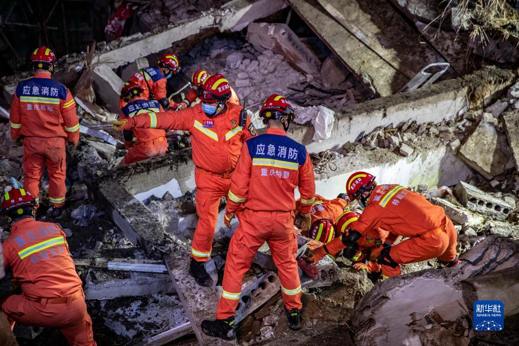 1月7日,在重庆市武隆区凤山街道办事处食堂坍塌现场,救援人员在开展救援。