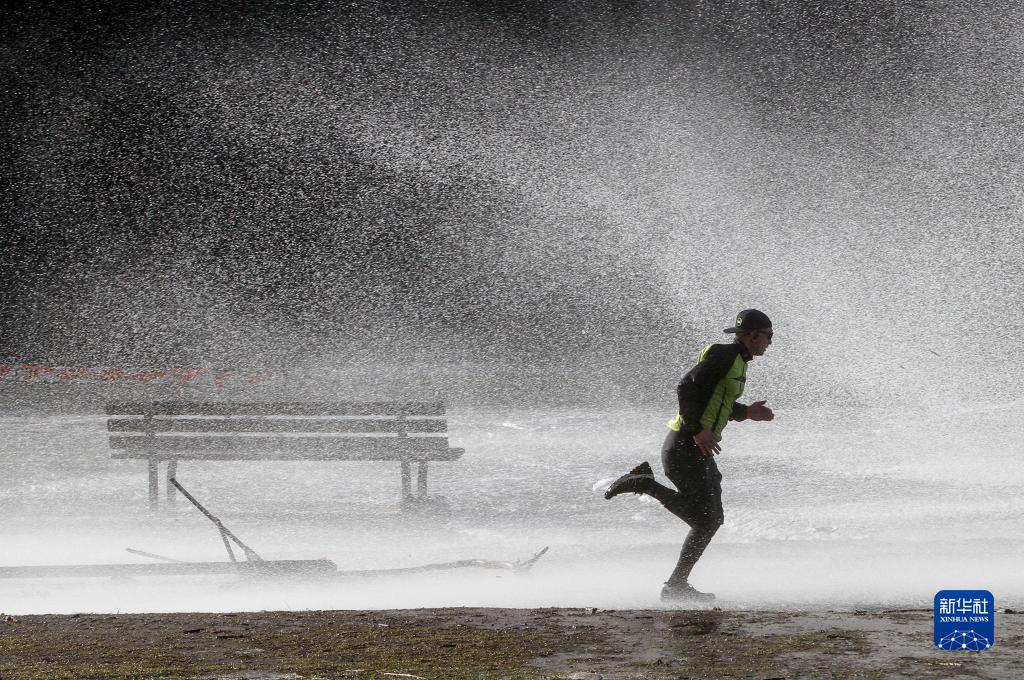 1月7日,在加拿大温哥华,一名男子在英吉利湾的风浪中跑步。