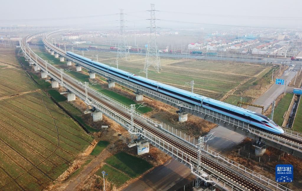 1月9日,一列动车组列车行驶在江苏连云港市境内(无人机照片)。