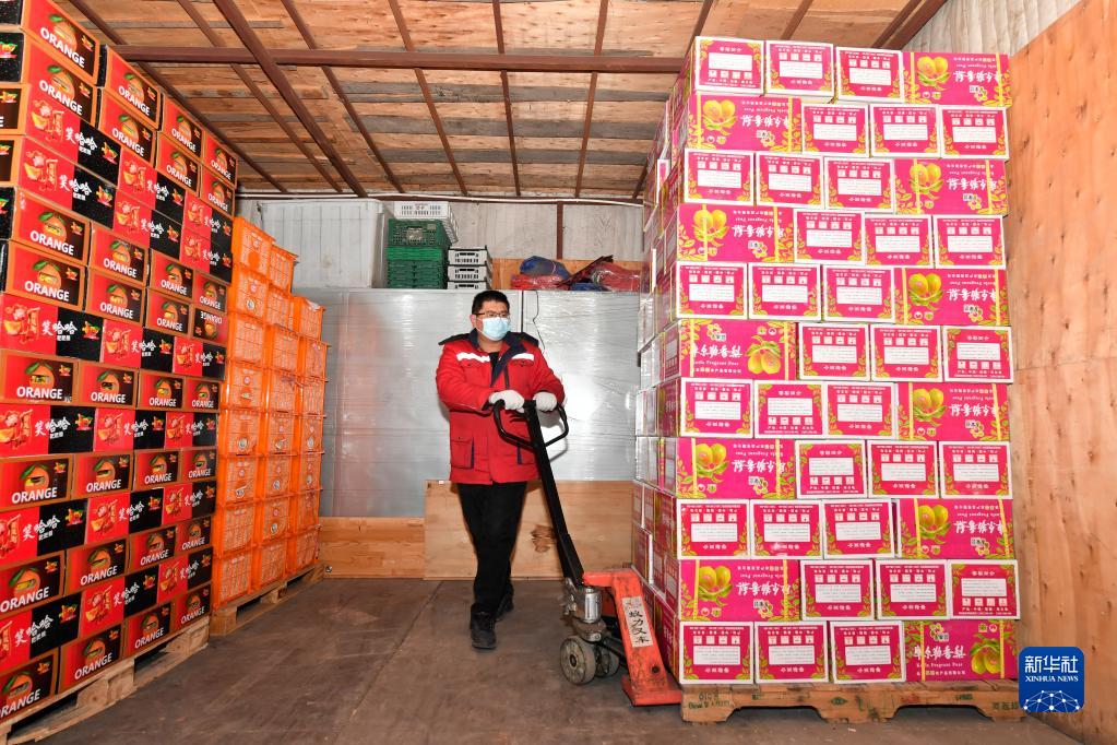 1月11日,商户在天津市红旗农贸综合批发市场的库房内整理水果。